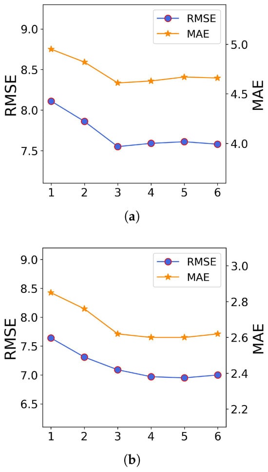 As shown in Figure 3a,b, when the number of layers in 3DGCN was restricted to one or two, ARFGCN exhibited suboptimal predictive performance on the BikeNYC and YellowTaxi datasets. This limitation stems from an inadequately small receptive field, where regions only perceive information from first- or second-order neighbors, failing to capture the influence of higher-order neighbors and the associated spatiotemporal correlations. Furthermore, with only one or two layers, ARFGCN struggled to effectively adjust the receptive field across different regions. Conversely, when the layer count of 3DGCN ranged from three to six, ARFGCN’s predictive performance was not significantly sensitive to layer variations. This indicates that even with multiple layers, ARFGCN can adaptively adjust the receptive fields, avoiding the pitfalls of incorporating irrelevant information and subsequent declines in predictive performance. It also verifies the effectiveness of the TARF.
