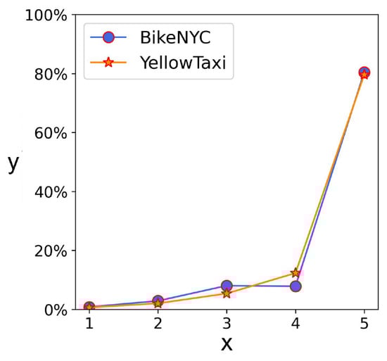 Comprehensive experiments are conducted on the BikeNYC dataset [] and the YellowTaxi dataset, obtained from https://www1.nyc.gov/site/tlc/about/tlc-trip-record-data.page (accessed on 1 May 2022), to evaluate the proposed approach. Each dataset comprises three subdatasets: crowd flows, OD flows, and POI information. The POI data are obtained from the OpenStreetMap repository. Following [], the POI categories for both datasets span nine distinct classes: dining, residential, shopping, educational institutions, nightlife venues, tourism, arts and entertainment, outdoor recreation, and other professional facilities. The details of the datasets are presented in Table 1.