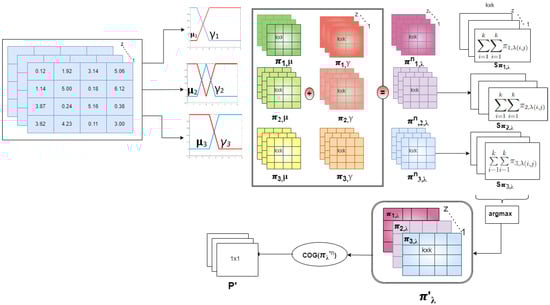 The premature aggregation of the blocks (sum), after the immediate application of intuitionistic functions, makes the direct clarification of the fuzzy process almost impossible. But this does not prevent the mathematical rules governing the fuzzy averaging of the various tasks from being spelled out in equation form. Indeed, , the transformation of the bloc into a single crisp value can be seen as the calculation of a fuzzy average of the set that implements the membership determined by Equation (9). In this sense, each patch n is governed by the following mathematical rule: