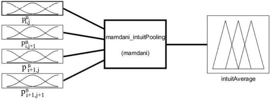In order to transform the fuzzy averaging procedure into an explicit fuzzy system (with inputs, outputs, rules, fuzzification, and defuzzification operators), we consider a sample of N images, which we break down into blocks. Then, we perform intuitionistic pooling for each block, forming an input–output dataset (vectors formed by the components, intuitionist pooling values). Next, we use enhanced self-generated dynamic fuzzy Q-learning (EDSGFQL) to systematically construct fuzzy inference systems (FISs) [55]. In the EDSGFQL process, the structural recognition and parameter approximation of SIFs are carried out using fuzzy cmeans [56] for grouping the input data space when generating SIFs. Meanwhile, the frame and preconditioning components of an SIF are created by reinforcement learning, i.e., the fuzzy rules are tuned and deleted based on the reinforcement signals. In this sense, , and for , we obtain the sub-fuzzy-system presented in Figure 2. In this figure, , , , and represent the components of the patch n.