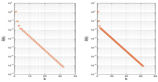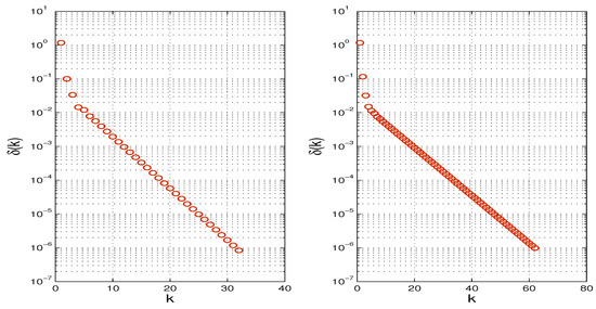 In Figure 1, we plot the quantity at each iteration for TP1 and TP2, computed by Algorithm 1, . We observe that the process is convergent both for the smooth functions , (TP1) and the non-smooth and discontinuous functions , , at the expense of a larger number of iterations in comparison with TP1.