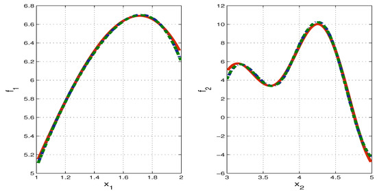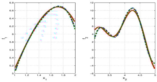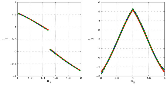 Exact (solid red line) and recovered , , Algorithm 1 (dash-dotted blue line) and Algorithm 2 (dashed green line), TP1, , , , , Example 2.