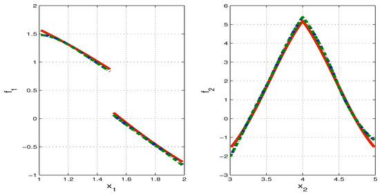 Exact (solid red line) and recovered , , Algorithm 1 (dash-dotted blue line) and Algorithm 2 (dashed green line), TP2, , , , , Example 2.