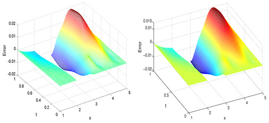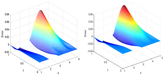 Error . in the whole space-time domain for TP1, , , Algorithm 1 (left) and Algorithm 2 (right), , , Example 2.