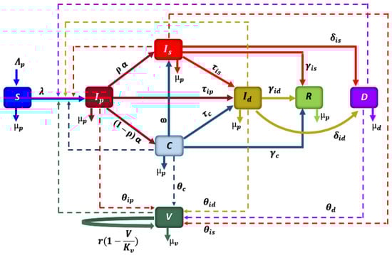 Finally, putting together all the equations described above, the following system of differential equations describing the model is obtained due to the various interactions between compartments.