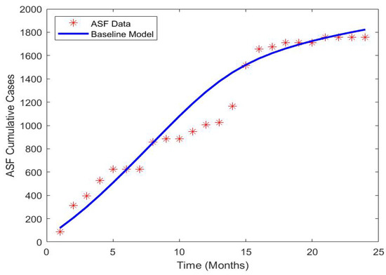 The results obtained from the model fitting to the monthly cumulative new reported cases of ASF are displayed in Figure 2.