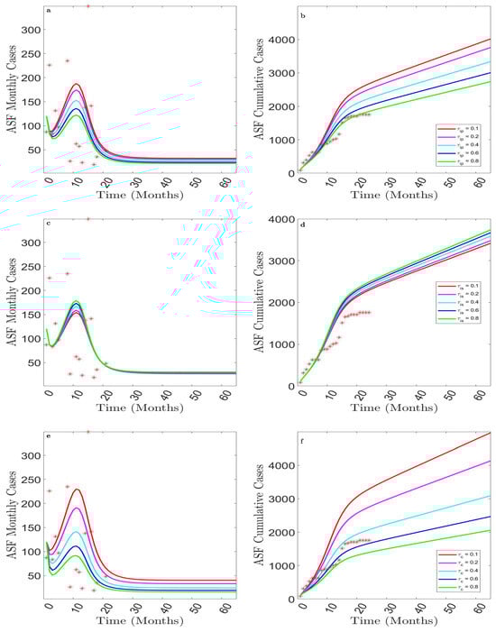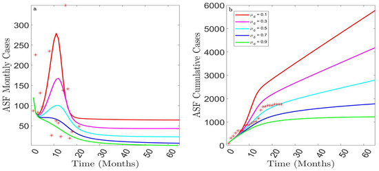 Impact of the burying or cremation rate of ASFV-infected dead pigs, , on the new monthly ASF cases (a) and the cumulative monthly ASF cases (b). *: reported cases.