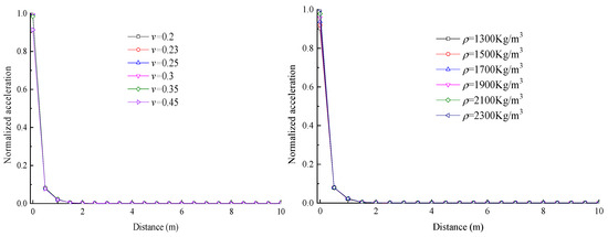 The attenuation rate of the normalized ground displacement amplitude in the x- and z-directions can be seen in Figure 3. Here, z means the direction in which the vertical load is applied, and x means the load’s moving direction. The displacement in the z-direction decays faster with the distance than that in the x-direction within 6 m from the moving load. The attenuation of the normalized ground acceleration is shown in Figure 4 as soil parameters and load velocity vary, as specified in Table 2. To quantitatively judge the influencing degree of the parameters, the sensitivity of the normalized ground acceleration was used [39,40]. Here, sensitivity is defined by the following equation with the change rate of the input parameter xi: