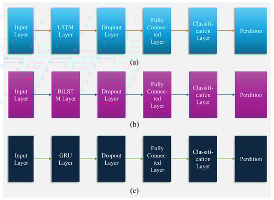 Model architecture for training data; (a) LSTM ML model architecture for interference reduction; (b) the BiLSTM ML model architecture for interference reduction; (c) the GRU ML model architecture for interference reduction.