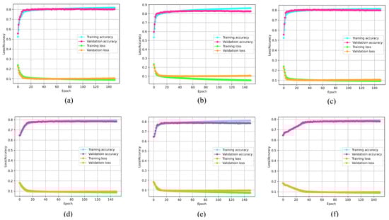 Accuracy and loss curve for different RNN techniques during model training; (a) LSTM training accuracy and loss with 10-device network; (b) BiLSTM training accuracy and loss with 10-device network; (c) GRU training accuracy and loss with 10-device network; (d) LSTM training accuracy and loss with 20-device network; (e) BiLSTM training accuracy and loss with a 20-device network; and (f) GRU training accuracy and loss with 20-device network.