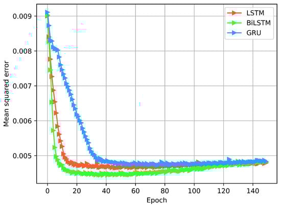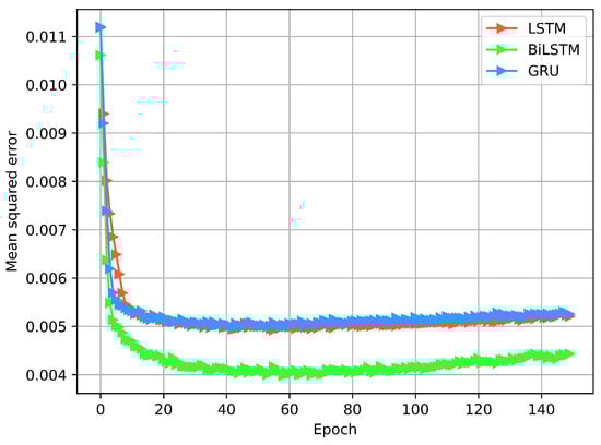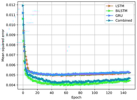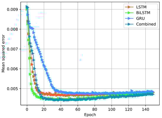 To assess the performance of complex RNN structures, we designed a model incorporating an LSTM layer, a GRU layer, and a BiLSTM layer. The input data first undergo processing by the LSTM layer, followed by a dropout layer with a retention rate of 85% (1–0.15). Similarly, the output from the LSTM layer feeds into the GRU layer, again followed by a dropout layer. Finally, the BiLSTM layer receives the processed data from the GRU layer, with another dropout layer applied. The output of the final dropout layer connects to a fully connected layer. As illustrated in Figure 8, for the 10-device network, the combined approach outperforms both the single-LSTM and -GRU models. However, the BiLSTM model still achieves superior performance compared to the combined model. Interestingly, when the number of devices in the network increases, the combined approach demonstrates significant improvement, surpassing the performance of single-layer models in terms of MSE, as shown in Figure 9.