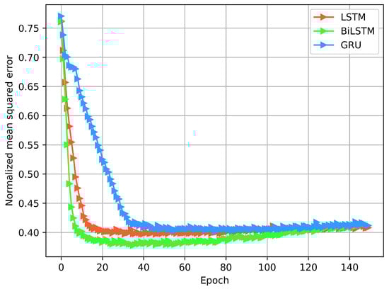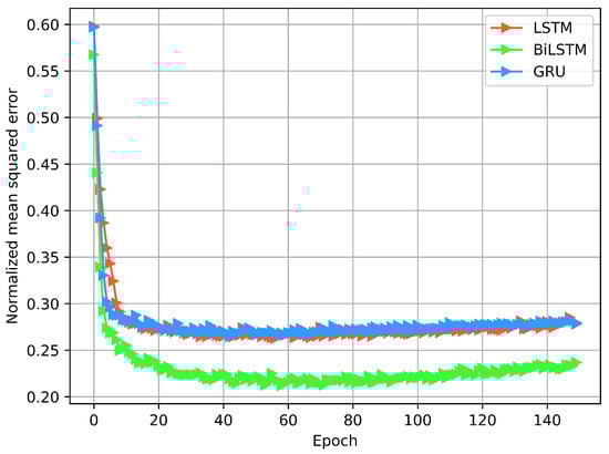 The corresponding results are depicted in Figure 6 for the 10-device network. In the case of NMSE, LSTM and GRU show similar results, as depicted in Figure 6. The mean and standard deviation for the NMSE of LSTM are . For GRU, the mean and standard deviation are , which are similar to those of LSTM. However, BiLSTM exhibits better performance than LSTM and GRU, as indicated by its curve being closer to the lowest NMSE value. For BiLSTM, the mean and standard deviation are . Thus, for the 10-device network, BiLSTM demonstrates the best performance among the three approaches, as shown in Figure 6.