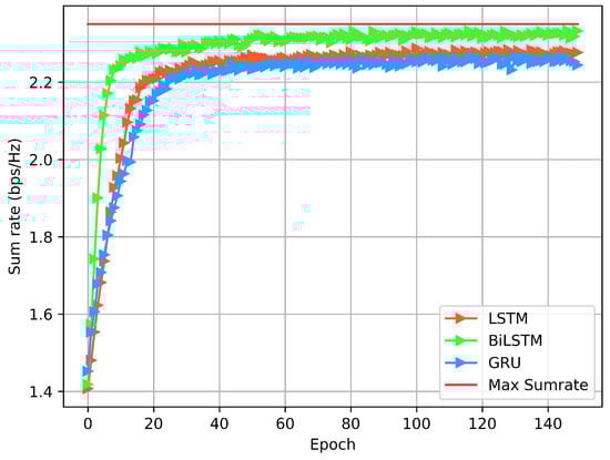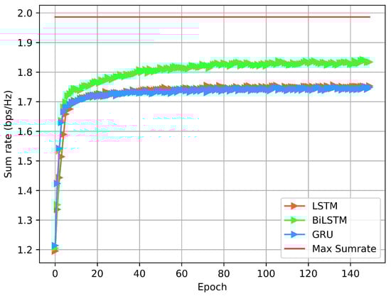 Figure 10 presents the maximum achievable sum rate for the 10-device network. It is evident from the figure that BiLSTM achieves a higher sum rate compared to the other two approaches, while LSTM and GRU demonstrate similar sum rates. Specifically, LSTM slightly outperforms GRU, with mean sum rates of and , respectively. In the case of the 20-device network shown in Figure 11, the overall performance of all approaches improves, and each approach approaches the maximum sum rate. In this experiment, we observed the better performance of BiLSTM, as it is closer to the maximum sum rate. LSTM secures the second position, with its curve being above that of GRU.