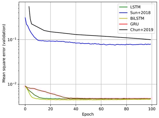 Figure 12 compares the MSE of the proposed RNN approach with the study conducted in [44,48]. In the study by Sun et al. [44], deep neural networks were adopted to reduce interference in the wireless channel. Additionally, Chun et al. [48] proposed a deep learning model based on successive interference cancellation. The comparison reveals that the proposed RNN approach achieves a lower MSE in the validation set compared to the approaches described in [44,48].
