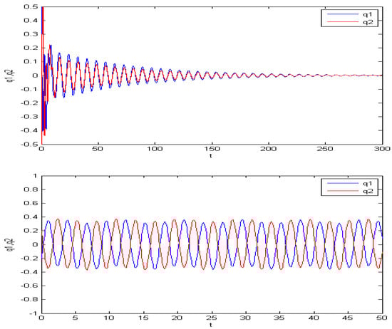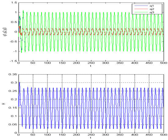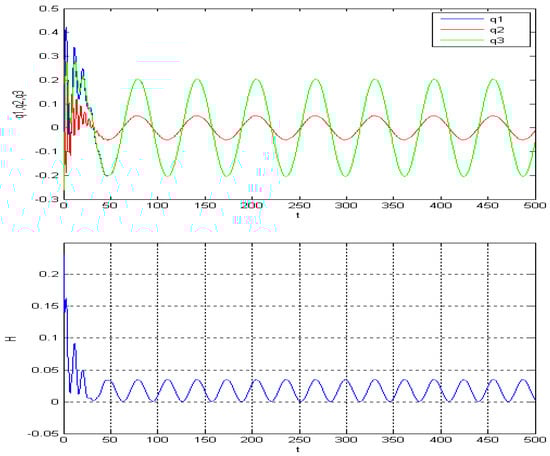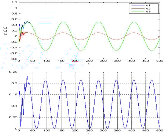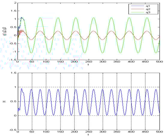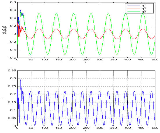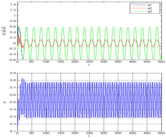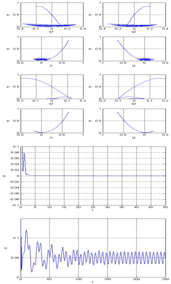 By generating images with varying parameters and conducting cross-comparisons, such as Figure 14, Figure 15, Figure 16, Figure 17, Figure 18 and Figure 19, we can see that the zero solution is not asymptotically stable; besides this, there is a periodic solution that relates to the driven term . In fact, the energy Hamilton is also a periodic function. Here, the amplitude of , and Hamilton can be determined by , , and frequently by .