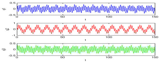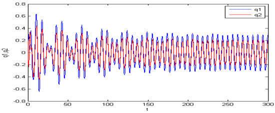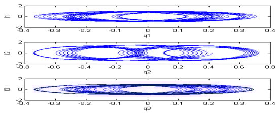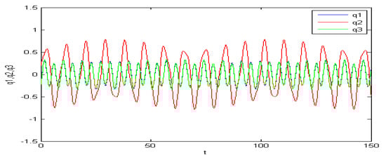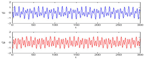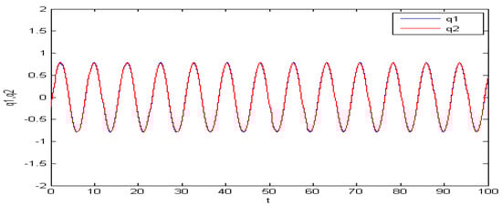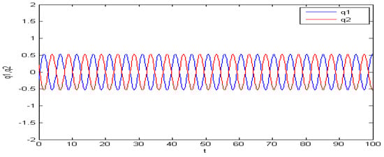 These phenomena are shown in the following figures. We chose . If the initial condition is (−0.2, 0.63, 0.22, 0.63) or (−0.2, 0.63, 0.2, 0.63), then two types of periodic charges may appear (see Figure 2 and Figure 3).