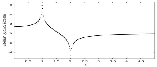 System (2) shows the coexistence of chaotic attractors. We can illustrate chaos via a Lyapunov exponents image (see Figure 4). According to the numerical results (see Figure 5 and Figure 6), the attractors can be obtained for the initial conditions (0.2, 0.1, 0.263, −0.892).