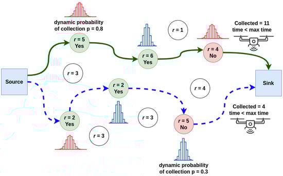 Figure 1 presents an illustrative example of a simple DTOP. The figure depicts the trajectories of two vehicles, each of them visiting three nodes. From each visited node i in a set N, a vehicle can retrieve (or not) a certain reward with a given probability . Hence, the actual reward collected by visiting a node can be with probability , or 0 with probability (Bernoulli experiment). This probability of success, , depends upon the status of some environmental factors (e.g., battery level, weather conditions, etc.) at the time when the node is visited. Nodes with a ‘Yes’ label represent successful reward acquisition, whereas nodes with a ‘No’ label indicate visited nodes where no rewards were obtained. Nodes left unvisited are colored in white. Not all nodes exhibit the same probability values, , under varying environmental conditions. To accommodate this variability, we introduce the concept of node types, where each type represents a group of nodes sharing the same probability for a given set of factor values. In other words, nodes within the same type exhibit consistent reward probabilities under similar conditions. Therefore, in our analysis, we consider distinct types of nodes. This approach results in a DTOP with heterogeneous nodes, meaning that nodes differ in their associated probabilities of reward based on their type.