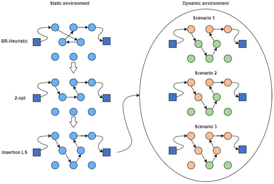 A 2-opt local search is employed to derive a solution aimed at reducing the total travel time to reduce travel time and allow for the inclusion of new nodes in the solution. Specifically, whenever a proposed arc swap yields a better solution than the current configuration. Subsequently, we attempt to incorporate additional nodes using the methodology outlined in Algorithm 1, continuing this process until the maximum allowable distance is reached. Figure 2 shows the process flow of the static algorithm. The initial step involves constructing a solution via the BR, as outlined in Algorithm 1. Following the construction of an initial solution, it is refined through a 2-opt optimization. Subsequently, an additional local search (LS) is conducted to ascertain any further enhancements, culminating in the iteration’s final solution. Lastly, this solution is tested within a dynamic environment to evaluate the performance of the static solution under changing conditions.