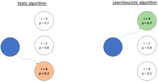 In Figure 4, the principal distinctions in the decision-making process for choosing a node are illustrated. The static algorithm, which does not utilize any predictive models, selects nodes based on distance and reward, regardless of the associated probability of actually receiving that reward. This approach may lead to choices where the likelihood of obtaining a reward is quite low. In contrast, the learnheuristic algorithm incorporates predictive analytics into its decision-making process. It utilizes information from a Thompson sampling predictor to make more informed choices. This method allows for a more strategic selection of nodes, taking into account not only the reward amount but also the probability of successfully obtaining that reward based on the predicted probability values.