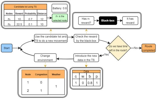 Therefore, whereas the static algorithm operates by generating multiple solutions initially and then evaluating these solutions within a dynamic context, the dynamic (learnheuristic) algorithm is characterized by its ability to operate in a constantly evolving environment. It does not generate multiple solutions. Instead, it adapts and recalculates solutions as the environment changes with each node selection. The algorithm is required to make real-time decisions without the ability to plan multiple steps. One critical consideration in the dynamic algorithm is the avoidance of local search methods. This is due to the potential reduction in rewards and increased complexity by the real-time changes in the environment. Every inclusion of a node into an emerging solution alters the environment. Figure 3 shows the flow of the learnheuristic algorithm. Throughout its execution, the algorithm records data pertaining to each visited node including congestion levels, weather conditions, and battery status as well as the node’s state regarding reward availability. This information is systematically compiled by vehicles through sensors and communication technologies embedded in them, sent to the central system, and utilized to calibrate the Thompson sampling model, improving its predictive accuracy for future iterations and generating a data traffic scheme specific to the IoT framework.