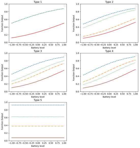 For conducting the numerical experiments, it is necessary to establish the black-box parameters, which determine the varying probabilities of earning rewards at each node, depending on environmental conditions. In the design of the experiment carried out, the betas have been selected in such a way that the probability curves were sufficiently different depending on the established magnitude of difference (Low, Medium, High) and had coherent probabilities. In our analysis, the variables have been standardized to a range of to 1 in order to ensure consistency and comparability. In order to create node types that are stable in terms of probability when all conditions are neutral, is set to 0 for all scenarios. For instance, is assigned a negative sign, indicating that better weather conditions improve the probability of receiving a reward. Similarly, , which is linked to traffic congestion, also follows this standardized scale. On the other hand, carries a positive sign, reflecting an increase in the probability of reward when the battery is fully charged (represented by 1) and a decrease when the battery is low (represented by ). This standardization of values facilitates a clearer understanding and interpretation of their impact on reward probabilities. In our experiments, we have set , i.e., a total of five types of nodes have been considered, each with distinct parameters and behaviors. For example, the probability associated with type node 5 is independent of the battery level. We have also established three sets of dynamism, each representing a different level of variability. With higher levels of dynamism, environmental conditions play a more significant role in determining the probability of receiving a reward. Table 1 provides detailed information on the probability of each node providing the possible reward. This probability is calculated based on various scenarios that combine factors such as weather, congestion, and battery level. Notice that the battery level significantly influences this probability for most types of nodes. Figure 6 depicts a graphical representation of the five different types of nodes in the low-level scenario. The color coding represents different environmental conditions to generate heterogeneous nodes: blue lines indicate good weather and no congestion, green lines represent bad weather without congestion, yellow lines indicate good weather with congestion, and red lines denote bad weather coupled with severe congestion. This color scheme provides a clear visual representation of how different environmental factors affect the probability of receiving rewards at each node. Node types can be more affected by some environmental conditions than others.