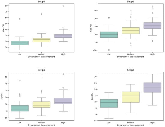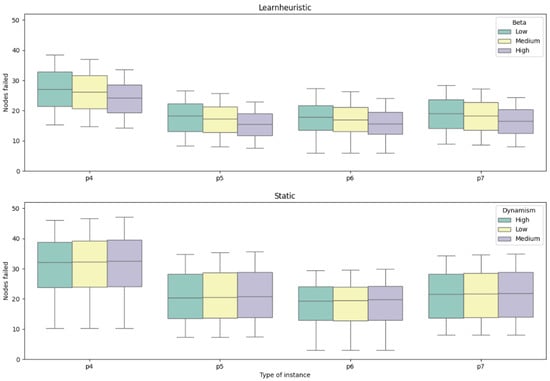 Figure 7 and Figure 8 depict the comparative results of our learnheuristic approach and the deterministic method employed. Specifically, Figure 7 illustrates the gaps between the static and learnheuristic approaches for the four different sets of tested instances and levels of environmental dynamism, where the discontinuous line represents the base deterministic solution obtained using the PJHeuristic and simulated in the dynamic scenario. Each subplot corresponds to a specific instance and not only clarifies the trend of an increasing performance gap with escalating levels of environmental dynamism—from low to medium to high— but also highlights that the vast majority of these gaps are positive. This indicates that the learnheuristic algorithm has a better capacity to adapt and generally yields superior results in dynamic settings. On the other hand, Figure 8 depicts the distribution of fail nodes, highlighting the algorithm’s robustness in maintaining node integrity across instances to . Thus, the learnheuristic approach demonstrates a greater capacity to avoid nodes with a higher likelihood of failure in more dynamic environments, and whereas the probability of obtaining a reward in low-dynamic settings is approximately 0.6, this probability can increase to 0.9 in highly dynamic environments. The analysis of node failures and performance discrepancies across various instance types enhances our understanding of algorithmic efficacy in dynamic scenarios. Notice that near-optimal solutions obtained using a deterministic approach can be sub-optimal or even infeasible (with a total collected reward of 0) in dynamic scenarios. Thus, the proposed learnheuristic is able to provide solutions with superior performance in such scenarios. Although we have used PJHeuristic as the deterministic approach because it is widely used in the literature to solve the TOP, its behavior in dynamic scenarios can be extrapolated to any other deterministic heuristic due to the lack of mechanisms to consider dynamic components during their optimization procedures.