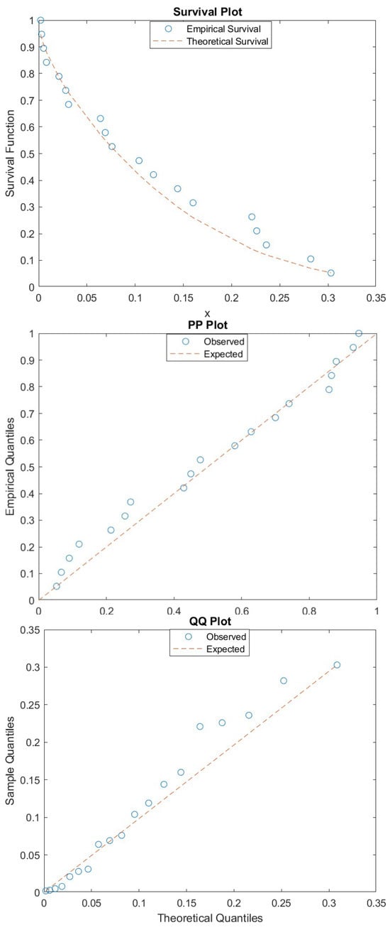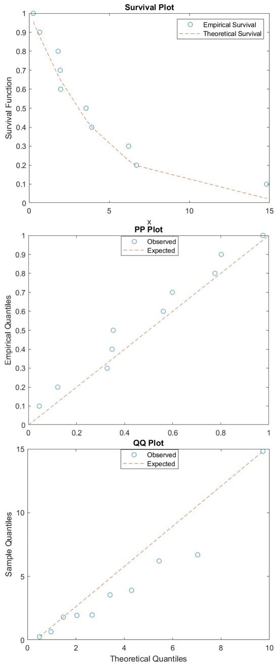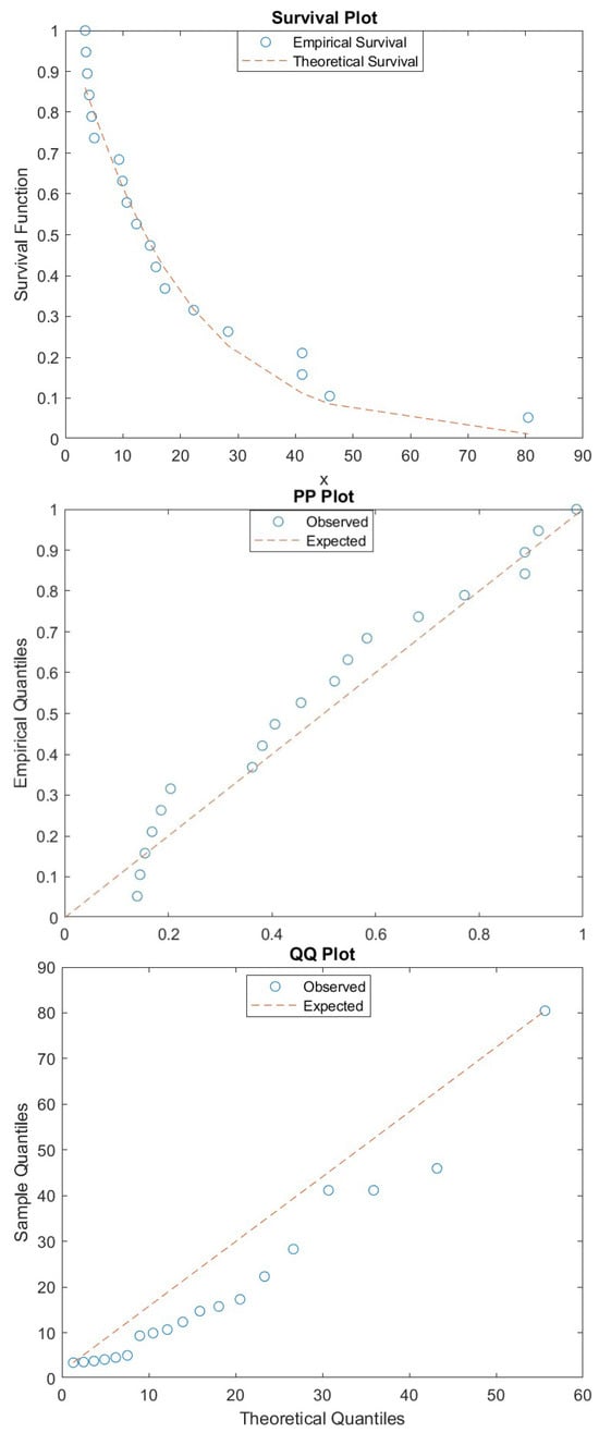 Empirical and fitted survival function, P-P, and Q-Q plots for the data set with for Multiple Myeloma.