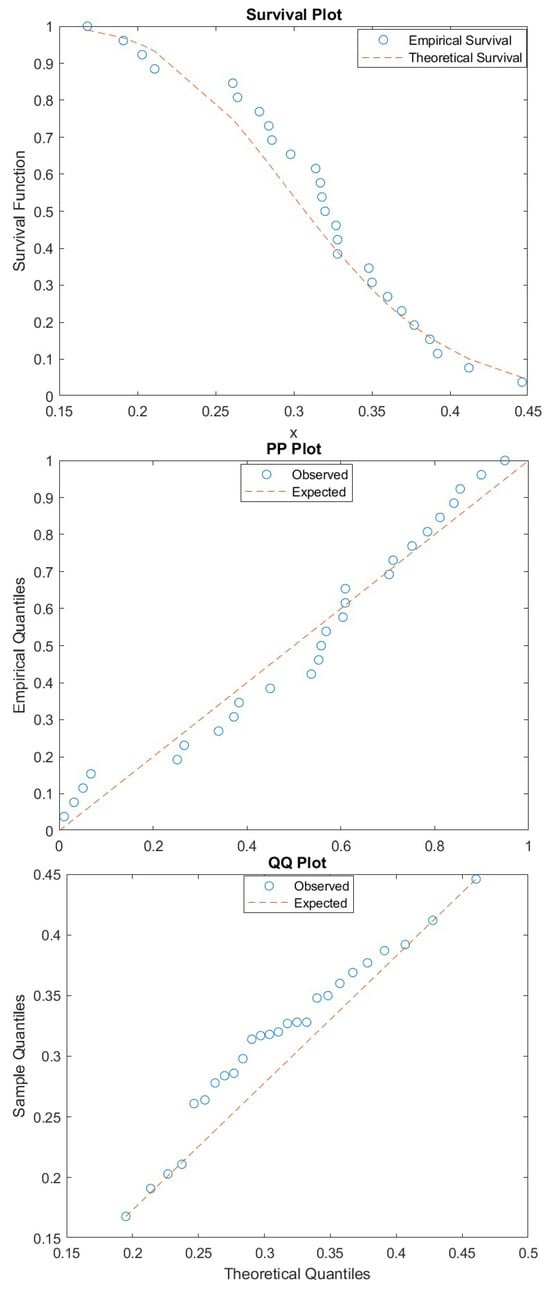 We analyze a genuine competing risks data set utilizing APCS to represent the effectiveness of parameter estimation under the underlying GLFR distribution. The data set includes 35 patients treated at University Hospital Hamburg-Effendorf, Hamburg, at Germany’s Clinic for Stem Cell Transplantation. The patients exhibit ten instances of transplant-related mortality as a competing risk and 19 cases of Multiple Myeloma recurrence. Information on recipients of transplants from donors with type AA, type AB, or type BB haplotypes was supplied by Donoghoe and Gebski [41]. While applying the competing risks approach, we focus on deriving statistical implications from these data. For with , Table 1 lists the times along with the censoring and event pattern. The times with represent the time to relapse, represents transplant-related mortality, and represents the censoring time with the removal . For and , the model efficacy is analyzed using some measures of fitness such as the Kolmogorov–Smirnov (KS), Anderson–Darling, and Cramér–von Mises tests. Both distance (statistics) and the p-value are evaluated to assess the suitability of our model to describe these data. It can be noticed from Table 2 that the p-values of all measures are greater than , ensuring the suitability of the proposed model to fit the Myeloma data. Figure 2 and Figure 3 illustrate the distance between the CDF for the GLFR distribution and the empirical distribution for the failure data, in addition to the observed probability distribution against the expected P-P plot and the quantile plot Q-Q for the two cases and , respectively.