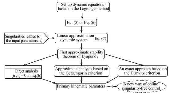 The analytical process shown in Figure 1 encounters two main challenges. The first is eliminating all acceleration terms and multipliers in the first-class Lagrange equation. The second challenge is to obtain an explicit analytical expression of the eigenvalue equation, which governs the motion stability of a PM dynamic system at singular configurations corresponding to the joint kinematic parameters. The former is quite technical, while the latter is more complicated for complex PMs, such as a 6-SPS PM. Different from the singular configuration determined by the pose parameters of the movable platform, the singular configuration in this paper is closely related to the joint parameters, such as the input parameters [38], treated as the bifurcation parameters. Thus, the method to avoid singularity can be constructed by detecting the input parameters. However, the singular configuration determined by pose parameters cannot be used to construct this type of singularity-free approach.