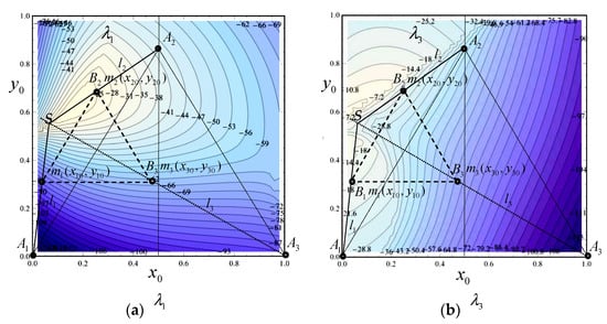 To study the motion stability relative to the position of the instantaneous center of absolute velocity of the movable platform, let represent the instantaneous center of absolute velocity of the movable platform, and let represent the angular speed of the movable platform around the center; thus, the velocities of the joints are and . Without the loss of generality, let in be constant. The polynomial of the eigenvalues determined by the linear approximation of the 3-RPR PM dynamics system of Equation (6) with respect to the instantaneous center of absolute velocity and the angular speed can be obtained. The distributions of the real parts of eigenvalues corresponding to the coordinates of the instantaneous center of absolute velocity are shown in Figure 2a.