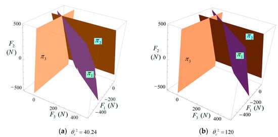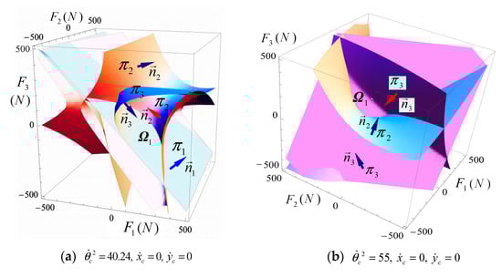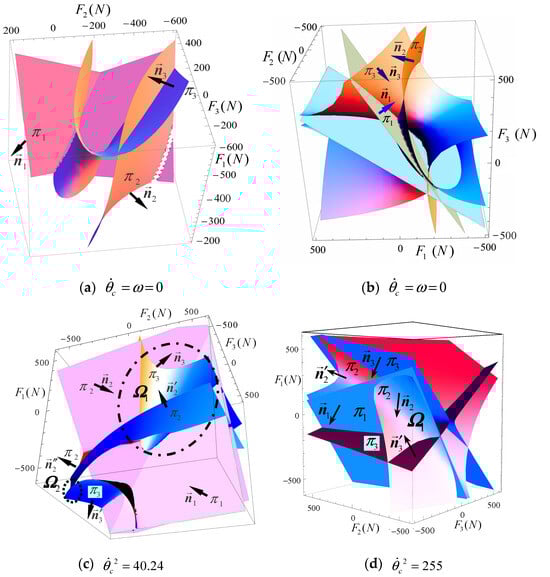 Consider that the ranges of the external loads are confined within . Three external load distribution surfaces, , , and , satisfying the requirements of the dynamic stability at static singularities corresponding to Equation (15), are shown in Figure 4a. In the plane, > 0 is distributed along the direction of the normal . > 0 is distributed in the outer space of the surface based on along the direction of the surface normal . As increases, expands outward in the direction. > 0 is distributed in the inner and outer space of the surface based on along the direction of the surface normal . As increases, the complex surface of the space shrinks inward toward . In the eight quadrants, , , and intersect only in the first quadrant. Therefore, the range that can meet the dynamic stability requirements at static singular configurations is the local space enclosed by the surfaces and in the first quadrant. Obtaining this local space with stable motion by trial-and-error numerical methods is challenging. When the values of are altered, the intersecting distribution spaces of the external loads that satisfy dynamic stability at singularities may undergo changes or even cease to exist.