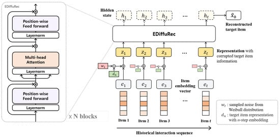 Recently, Li et al. [] proposed a new DM for sequential recommendation. They defined sequences in the preprocessing stage of the dataset, organizing interactions in chronological order and treating the most recent interaction as the target data for training. This preprocessing allows for the direct reflection of users’ temporal information. Moreover, they utilized the DM’s ability to generate distributions to represent the latent features of items and the multi-level interests of users. The introduction of noise in the DM acted as a factor inducing a more robust learning process. Instead of the Mean Squared Error (MSE) used in the previous DDPM, they employed cross-entropy loss for relevance calculation in the reverse process due to the static nature of item embeddings. Additionally, they used transformers as an approximation for reconstructing item representations.