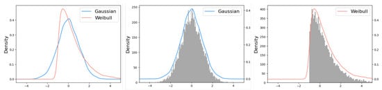where , and since the typical Weibull distribution only takes non-negative values to reflect noise across various ranges, we introduce a location parameter c allowing for variation across different ranges. Therefore, the probability density function of the proposed distribution is as follows: