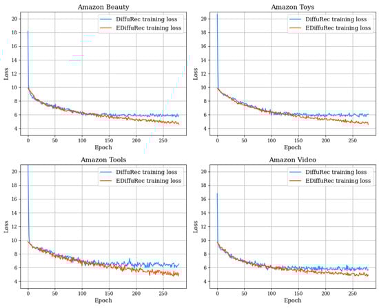 We illustrate the comparison of training losses between EDiffuRec and the baseline in Figure 3. Our proposed model, incorporating the L2 norm in the loss, starts with a significantly lower loss from the beginning of training. Moreover, using a warmup strategy to enhance the stability of the model, we observe even lower loss after 150 epochs.