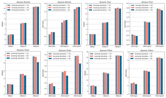 To further investigate the impact of warmup duration settings, we conducted performance comparison experiments on all datasets. The results are depicted in Figure 4. In the case of the Beauty dataset, there is not a significant difference in performance according to the HR metric, while a longer duration correlates with improved performance in the NDCG metric. In the Toys dataset, similarly, there is no significant performance difference in terms of HR metrics. However, in contrast to the Beauty dataset, performance improves with shorter durations. This difference is most pronounced in the Tools dataset, where it is evident that as the duration increases, performance remains notably low. For the Video dataset, a relatively shorter duration yields higher performance in both HR and NDCG at and . These findings indicate that performance could fluctuate based on the duration, emphasizing the importance of selecting an appropriate duration that suits the characteristics of the data.