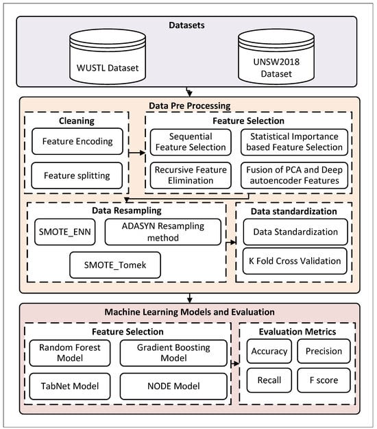 Figure 1 presents the architecture of the proposed work for intrusion detection. This study performed the experiments using the WUSTL and UNSW datasets. In the pre-processing stage, this study selected the optimal features using sequential feature selection, Recursive Feature Elimination, and statistical feature importance methods. This study also used data resampling methods such as SMOTE_ENN, ADASYN, and SMOTE_Tomek to resample the data. After this, RF, GB NODE, and TabNet models for intrusion detection were used. The performance of these methods was evaluated using the accuracy, precision, recall, and f-score metrics. Algorithm 1 shows the steps of the proposed methodology.