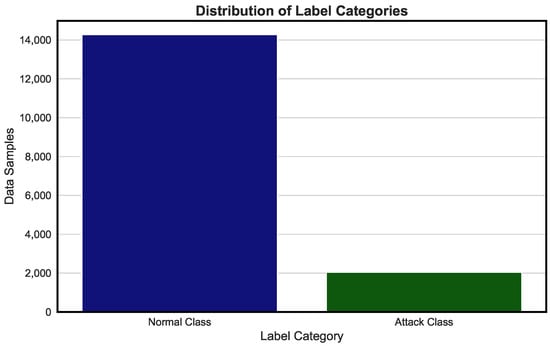 The WUSTL dataset belongs to the Internet of Medical Things (IoMT) environment, and it contains information on the biometric flow of the patient and the network flow metric. The Enhanced Healthcare Monitoring System (EHMS) testbed created this real-time WUSTL dataset. This dataset has 43 independent features and one target label. Thirty-five features in this dataset are related to the network flow metrics, and eight features are associated with the biometric flow of the patients. It has 16,318 instances, 14,272 related to the normal class, and 2046 to the attack class. The class distribution of the WUSTL dataset is presented in Figure 2.