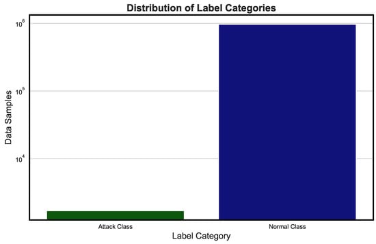 Figure 3 shows the class distribution of normal and attack classes. In this figure, the x-axis values show the class labels and the y-axis represents the data samples on the log scale. This study used the log scale on a y-axis to show the distribution of an attack class. In the attack class, we have 1690 data samples; in the normal class, we have 971,149 data samples.