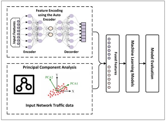 This study fused the extracted features after extracting them using the PCA and DAE. It used the early fusion method [37], which fuses information before starting the primary learning process. It helps to preserve the information from both methods to enhance the model performance. Figure 4 shows the architecture of the early fusion method.