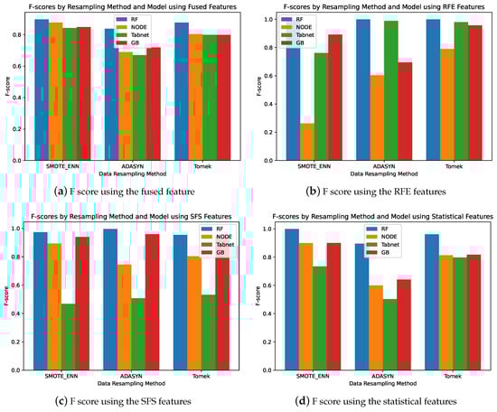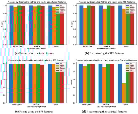 Figure 7 presents the f score of an ML model with different feature selection methods for an MITM attack classification. The x-axis of a figure represents the data resampling method, and the y-axis represents the f score of models for the data resampling technique. It shows that the RF model has a higher f-score value with the statistical and RFE feature selection methods. However, the TabNet and NODE models show more variability regarding the f score value for all feature selection methods. Data resampling and feature selection methods enable the learning models to achieve better prediction results.