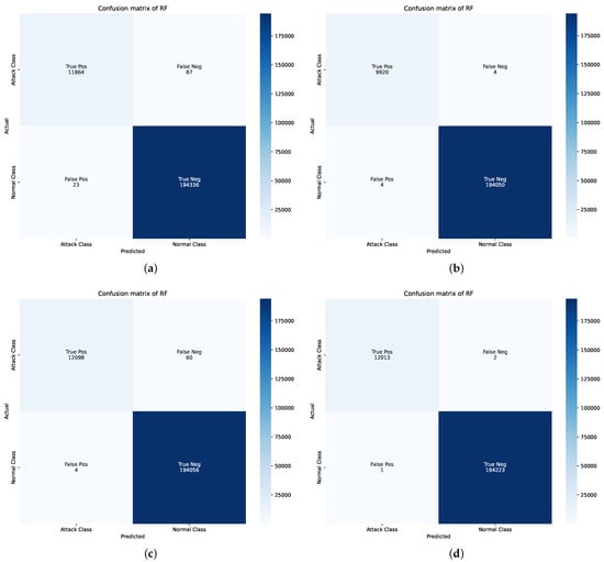Confusion metrics of RF model using different feature selection method for MITM attack classification. (a) Confusion metrics of RF model using fused features. (b) Confusion metrics of RF model using the RFF feature selection method. (c) Confusion metrics of RF model using SFS feature selection method. (d) Confusion metrics of RF model using statistical feature selection method.