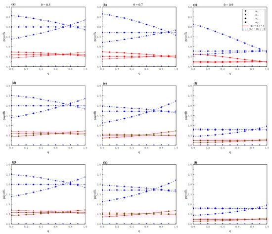 In addition, in the Google network (Figure 9), the payoff trends of LDP and HDP show a clear contrast, which highlights the heterogeneous characteristics of the network; that is, there are large differences in the degrees of each node. However, it is worth noting that the payoff trends of HEP-TDS and HDP-TDS are not identical, which indicates that there is no linear relationship between nodes with high degrees and their corresponding feature values after deleting the nodes. In particular, if the target strategy corresponds with HEP, exceeds in terms of payoff when the value of is large (), showing a significant advantage. In this scenario, the impact of changes in the value of q on the payoff matrix is almost negligible.
