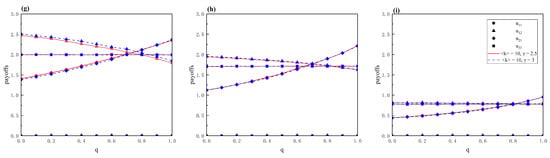 Payoffs of the attacker in the payoff matrix as a function of q with different strategies and on a scale-free network. The TAS and TDS correspond with a low-degree priority strategy, i.e., LDP-TAS and LDP-TDS (a–c). The TAS and TDS correspond with a high-eigenvalue priority strategy, i.e., HEP-TAS and HEP-TDS (d–f). The TAS and TDS correspond with a high-degree priority strategy, i.e., HDP-TAS and HDP-TDS (g–i). Parameters: , <k> = 10, .
