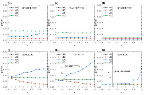 Payoffs of the attacker in the payoff matrix as a function of q with different strategies and on the ER random network. The TAS and TDS correspond with a low-degree priority strategy, i.e., LDP-TAS and LDP-TDS (a–c). The TAS and TDS correspond with a high-eigenvalue priority strategy, i.e., HEP-TAS and HEP-TDS (d–f). The TAS and TDS correspond with a high-degree priority strategy, i.e., HDP-TAS and HDP-TDS (g–i). Parameters: , <k> = 10.