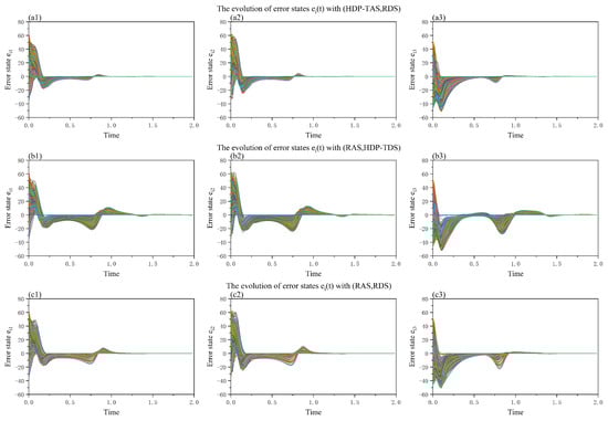 Finally, to verify the correctness and effectiveness of the above payoff matrix, we also conduct simulation experiments combined with synchronous dynamics on the network in Figure 6. We first determine the actual controlled node based on the attacker and defender strategies. Then, the evolution process of the node state is obtained based on the specific synchronization dynamics. Among them, the target states of nodes are Chen’s chaotic system, and the pinning control scheme is performed using an adaptive controller to control the nodes that are successfully attacked. A detailed description of the network synchronization dynamics is provided in Appendix A. The parameter settings of Figure 6 correspond to Figure 2d. When in Figure 2d, . In Figure 6, we can clearly see that the network can achieve synchronization faster when the attacker-defender strategy pair is (HEP-TAS, RDS). The network synchronization results of the attacker-defender strategy pair (RAS, RDS) are also better than the results of the attacker-defender strategy pair (RAS, HEP-TDS). In summary, the above results verify the rationality of the attacker-defender game model proposed in this paper.