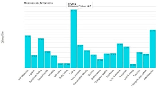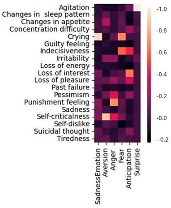 - The weight of the emotions regarding symptoms of depression (values obtained in step 7) is multiplied by the weight of symptoms obtained in the first phase of this process (step 3) and then multiplied by the emotion value obtained by the MeaningCloud tool to obtain the final score that indicates the total value obtained from the model. Figure 1 shows the correlation between symptoms and emotions resulting from this process. As can be seen, there is a strong correlation between the emotion of aversion and the symptom of self-criticalness, between the emotion of sadness and the symptom of crying, as well as between the emotion of surprise and the symptom of agitation.