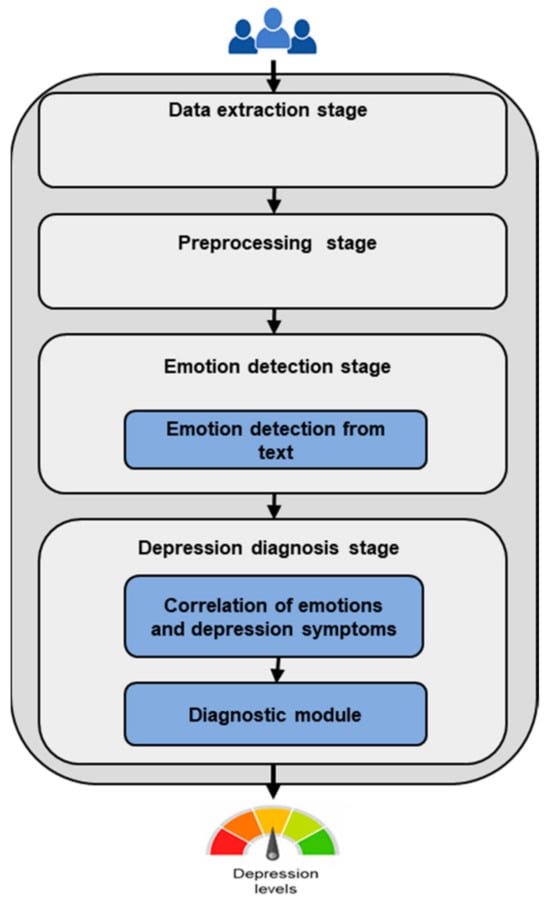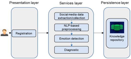Service layer. The service layer is divided into four modules. The first is the social media data extraction/collection module, which is responsible for extracting and gathering comments from registered users on social media. The NLP-based preprocessing module is responsible for carrying out NLP-based preprocessing tasks to effectively understand and analyze the data collected. The emotion detection module is responsible for detecting emotions from the text; this module is where the emotion–symptom correlation that was previously explained is applied. The diagnosis module is responsible for applying the depression detection model and determining the value that allows for the depression level to be determined.