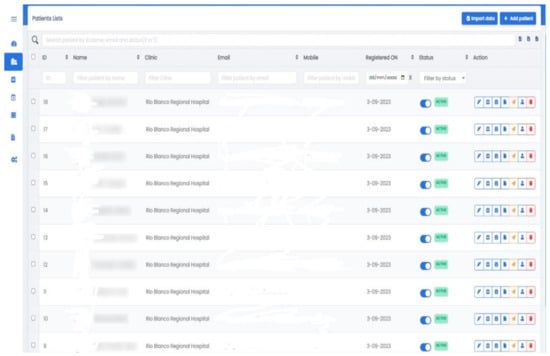 Patient List. This section shows the doctor’s patient list (see Figure 4). The information presented include the patients’ names, clinics, emails, mobile device numbers, registration dates, statuses, and actions to be carried out.