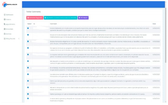 Patients’ posts. When the doctor selects a patient, Mental-Health shows the patient’s posts obtained from a social network, in this case, from X (see Figure 5).